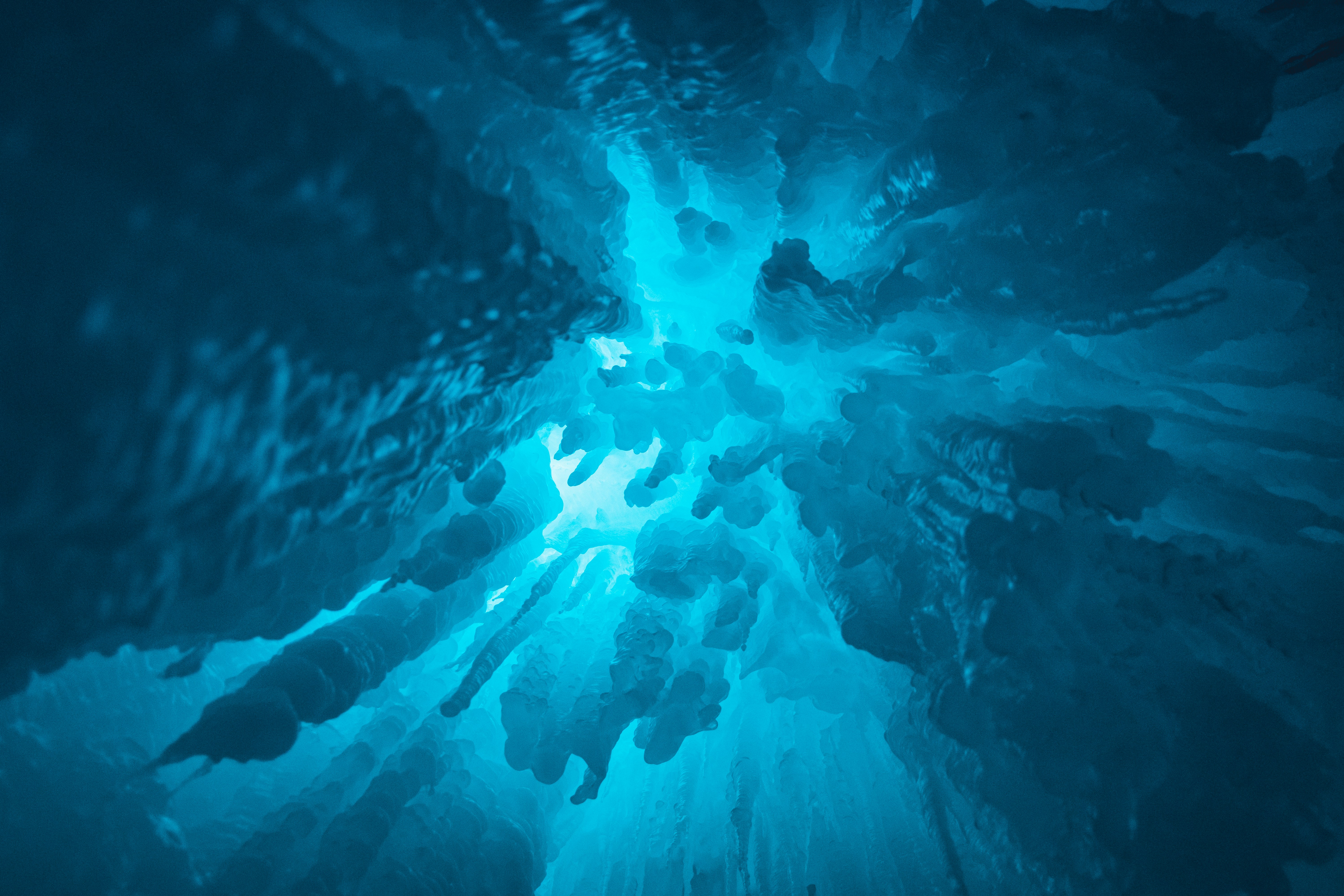 We swim further on. There is no shore, no horizon, only below or above. The difference between our languid pace and how each new glance reveals something freshly incomprehensible makes me dizzy. Our guide points to make sure we realise what we are looking at. This is the section they call the cathedral. Instead of spires grasping upwards, there are pinnacles inverted. On land, I thought this a fanciful name. Now, I see the schism where two continents continuously wrench apart, the fracture between them. I am undone. Within the gap is the detritus of the shock, the perpetual movement of the earth. I exhale. The air hisses through my clenched teeth. I suck and the cold rasps my mouth.